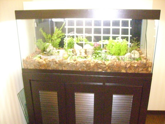 | A魚缸改造-6尺 白色奇石與常綠森林組合造景 | B魚缸改造-6尺(頂部門板包住) 鄉村田園風組合造景 | ||