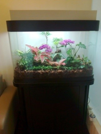 | H舊魚缸5尺之改造前- 此魚缸已經使用十年以上了! | J.專業改造完成後- 四面景觀設計蘭花奇木與常綠造景 | ||