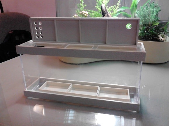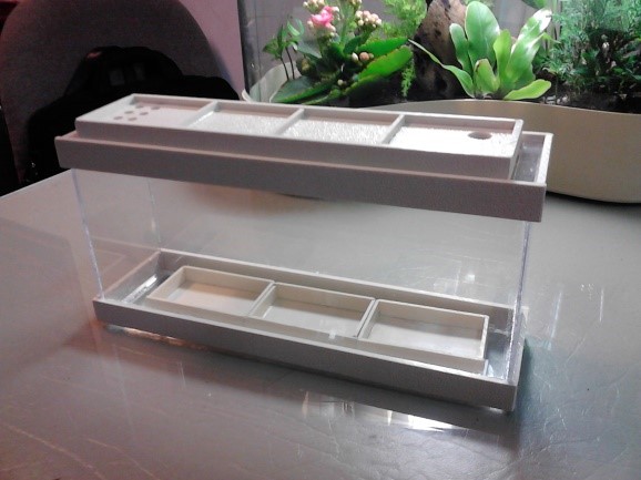| K專業改造內容-(模型示意) (1)上面為主機維生系統 (2)下面為組合式栽培盆 | L照顧重點-(模型示意) 須每3~7天加水一次, 將上面主機蓋垂直立在魚缸上即可進行。 | ||